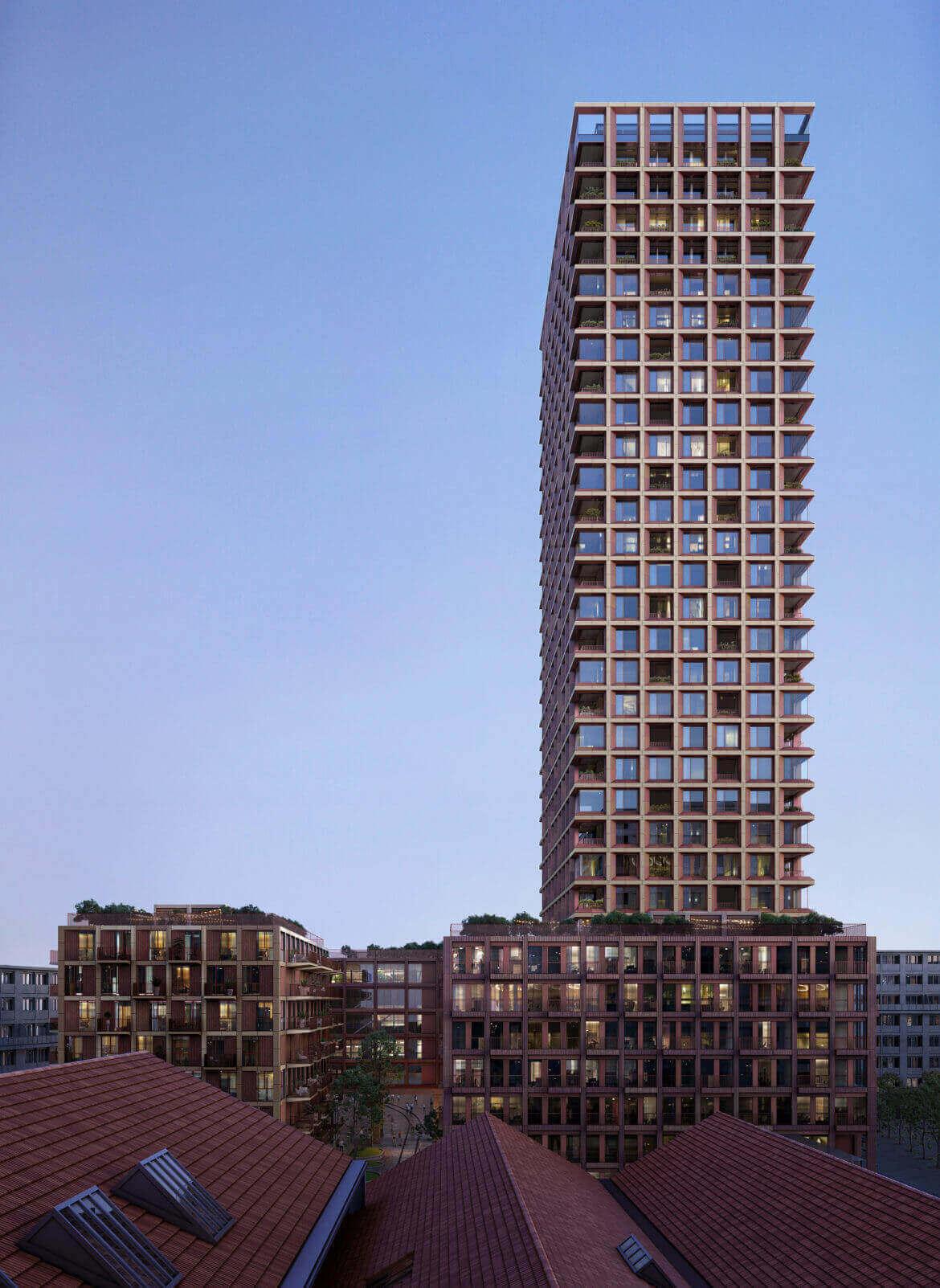 Это позволяет заменить бетонное ядро, которое обычно используется в здании такой высоты, на дерево. Фасад будет облицован темно-красным и желтым терракотовым кирпичом с пыльно-зелеными деталями, отражающими красные крыши и желтый кирпич окружающих зданий.