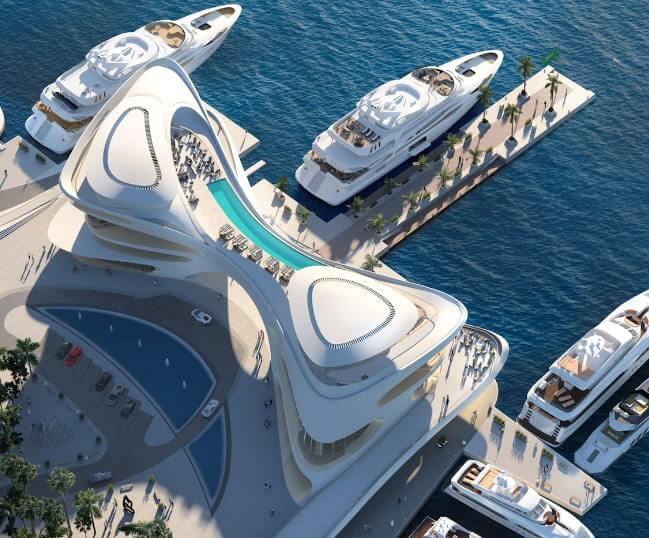 Объект площадью 7 900 кв. м будет иметь 120 причалов для судов, длиной до 130 м и лифт прямо от кромки воды до элегантной частной лаунж-зоны, чтобы гости могли добраться со своих лодок до клубного дома «в полном уединении».