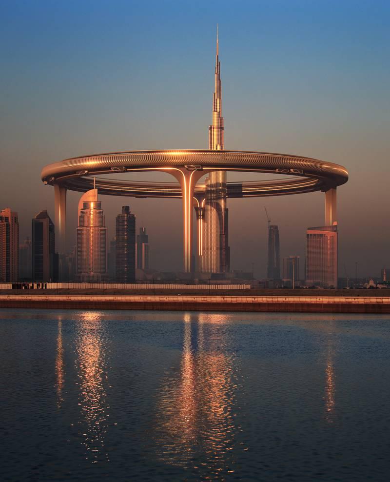 Кольцо будет находиться на высоте 550 метров. При этом в центре кольцевого небоскрёба окажется высочайшая башня в мире Бурдж-Халифа (высота – 828 метров).
