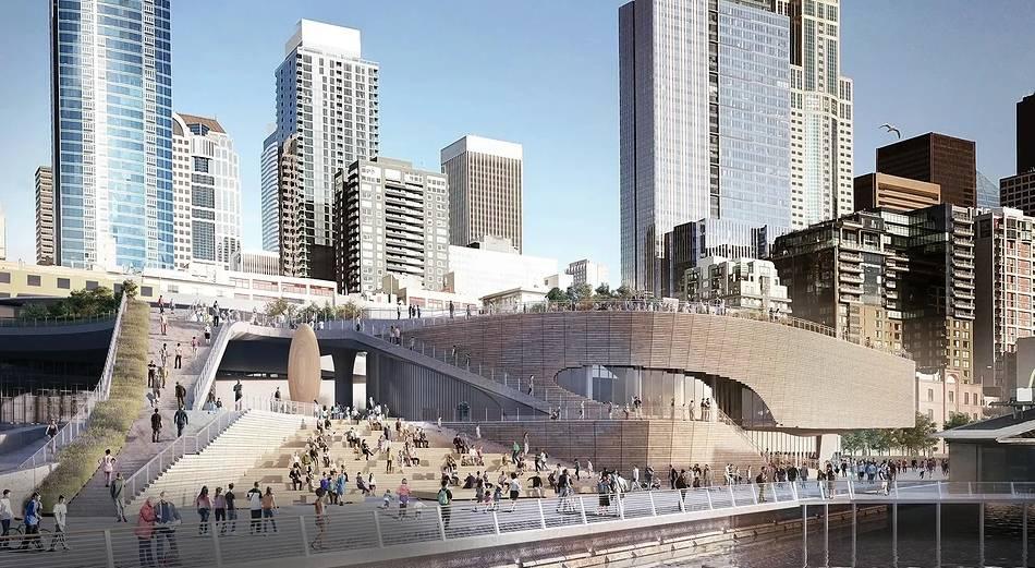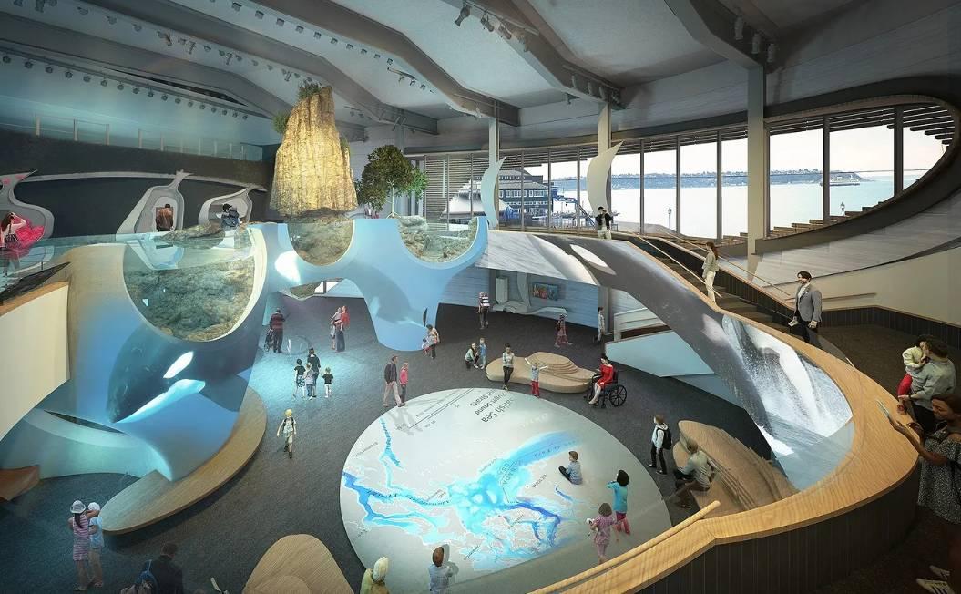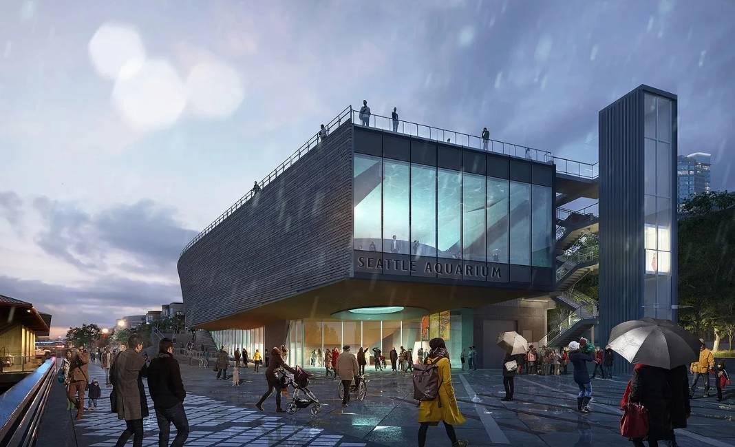 павильона с эксплуатируемой кровлей для океанариума в Сиэтле. Архитекторы планировали вписать павильон в городскую инфраструктуру, поэтому его решили интегрировать в сеть улиц и набережную.