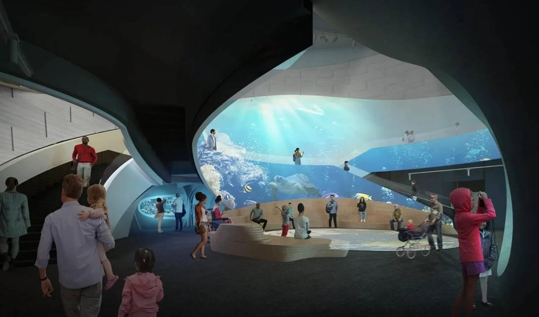 Из-за своего оригинального фасада здание будет напоминать холм, будто выросший посреди города. По периметру установят большие окна, чтобы привлекать внимание прохожих. Площадь галерей составит 4,6 тысяч квадратов. Внутри будет два этажа с выставками — от классических до иммерсивных, а также разных размеров аквариумы с большим количеством разнообразных рыб.
