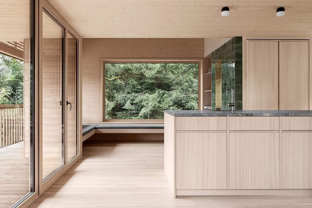 Отделку внутри помещений тоже сделали из древесины, чтобы она сочеталась с экстерьером здания. Для лучшего обзора на горные пейзажи практически во всех комнатах есть большие окна.