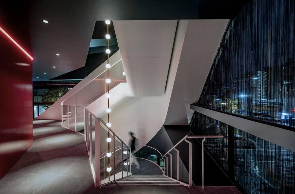 Основным помещением внутри стал многофункциональный театр, вокруг которого расположились рестораны, кафе, VIP-залы и просторные террасы у реки. В дизайне интерьера и экстерьера, предпочтение было отдано серебряному цвету. Он дает интересное сочетание с красными стенами и подсветкой.
