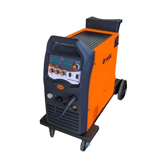 Сварочный аппарат JASIC MIG350 (N271) 380v Сварочный полуавтомат JASIC MIG-350 (N271) для полуавтоматической сварки на постоянном (DC) токе в среде защитных газов проволокой сплошного сечения (MIG/MAG) или же для сварки порошковой проволокой (FCAW). Как защитный газ используются аргон (Ar), углекислый газ (CO2) или их смеси. Дополнительные режимы: аргонодуговая сварка (TIG) и ручная дуговая сварка (MMA). Полуавтомат JASIC MIG-350 (N271) - это промышленное оборудование, применение которого в сварочном цеху или на строительной площадке. Запитывается от трехфазной сети 380В. Для транспортировки сварочный инвертор установлен на тележку с площадкой под газовый баллон. Встроенный четырехроликовый подающий механизм под кассеты с проволокой до 15 кг. Мощности механизма достаточно, чтобы использовать горелки с длинным шланг-пакетом от 5 м и больше, и при этом не опасаться, что проволока застрянет внутри канала - это позволяет работать на большем расстоянии от сварочного источника. Для работы самозащитной проволокой установлен штекер переключения полярности. На переднюю панель аппарата вынесены два разъема для подключения горелок: -евроразъем (KZ-2) под горелки для MIG/MAG -разъем 9 pin под горелки пистолетного (шпулечного) типа Управление аппаратом в режиме полуавтомата осуществляется специальным электронным блоком, обеспечивающий общую стабильность работы, поддерживает минимальный уровень разбрызгивания и глубокое проплавление металла, тем самым обеспечивая получение качественного шва. При работе в режиме ручной сварки встроенные функции позволяют легко поджечь дугу и использовать электроды практически с любым типом покрытия. Сварочный полуавтомат JASIC MIG-350 (N271) оборудован панелью управления с цифровыми дисплеями для индикации значений напряжения и силы тока. Основные параметры сварки управляются поворотными ручками с плавной регулировкой. Переключение режимов - тумблерами. Для экономии расходных материалов организован дожиг проволоки в конце сварки. ikarvon.uz