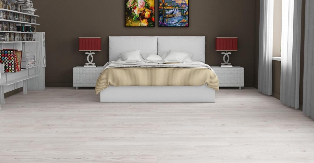Это покрытие толщиной 8 мм, порода дерева - дуб, фаска с 4-х сторон. Брашированная поверхность ламината имеет светлый оттенок и матовый блеск.