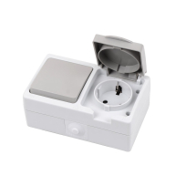 Выключатель одноклавишный + Розетка одинарная с крышкой для открытой установки Lezard IP54, белая