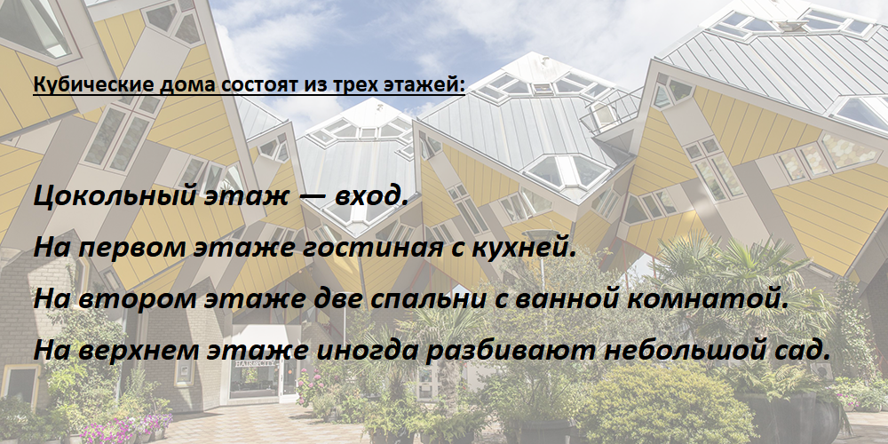 В Роттердаме есть 38 таких домов и ещё 2 супер-куба, причём все дома сочленены в единое сооружение. Несколько квартир находятся в частном владении, в других расположены офисы, хостел и даже школа, а один из домов отведен под музей, где каждый может лично проверить, удобно ли жить в доме вверх тормашками.