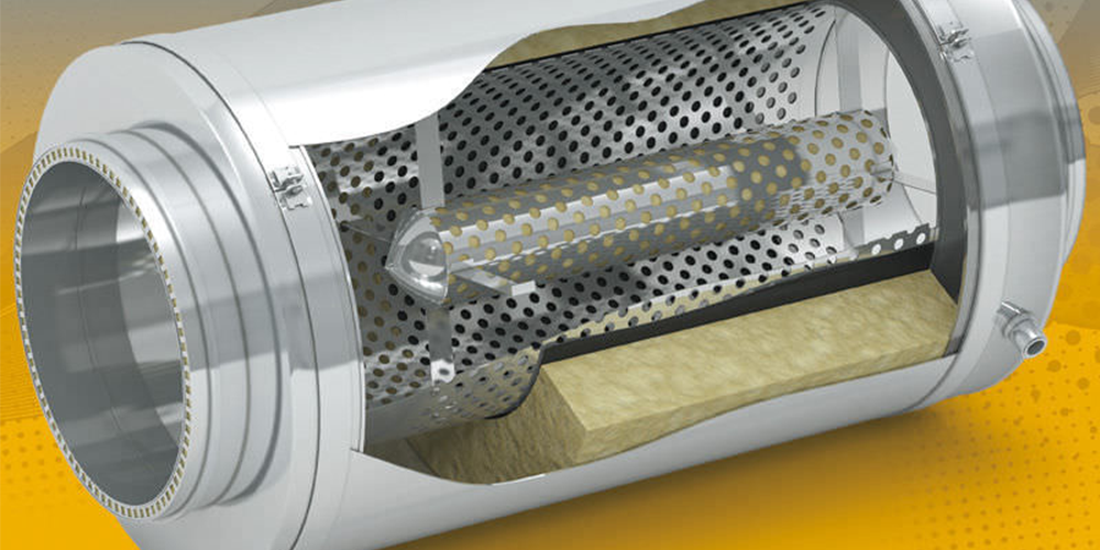 Принцип работы шумоглушителя основан на частичном снижении и изменении уровня акустических колебаний за счёт прохождения воздушного потока через звукопоглощающий материал.
